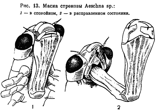 Голова личинок снабжена парой крупных фасеточных глаз, короткими 4-7-члениковыми усиками, хищными жвалами, а с нижней стороны — совершенно специфическим образованием — маской. Маска (рис. 13) состоит из 2 крупных члеников, концевой членик несет лопасти и крючки, расположенные по его краю. В спокойном состоянии маска сложена, и снизу виден ее концевой членик. В определительных таблицах используются особенности строения именно этого членика, который и назван собственно маской.